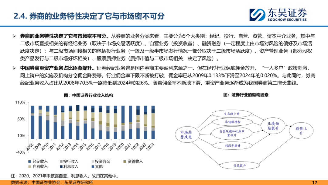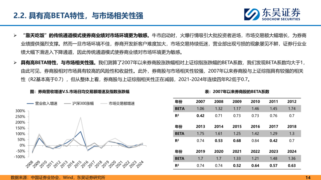券商 “二十年”复盘:谋时而动,顺势而为。1)“靠天吃饭”的传统通道模式使券商业绩对市场环境更为敏感。牛市启动时,大批投资者进场,市场交易额大幅增长,为券商业绩提供强烈支撑。然而一旦市场环境不佳,券商开发新客户难度加大,市场交易持续低迷,证券行业业绩进入下降通道,因此传统通道模式使券商业绩对市场环境更为敏感。2)券商股具有高BETA特性,与市场相关性强。2007年以来券商股与上证综指具有较强的相关性,但2021年以来券商股与上证综指相关性正在减弱。