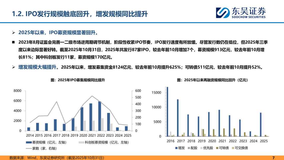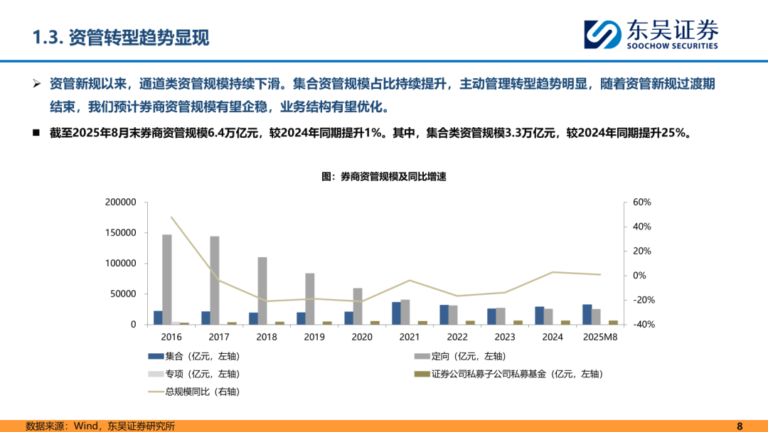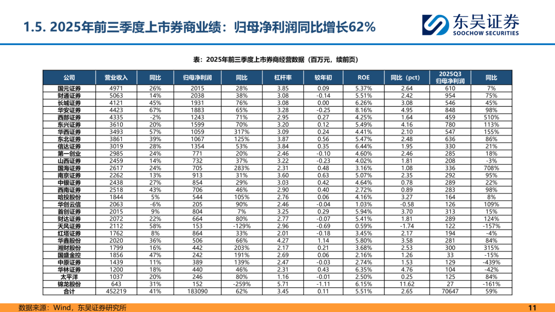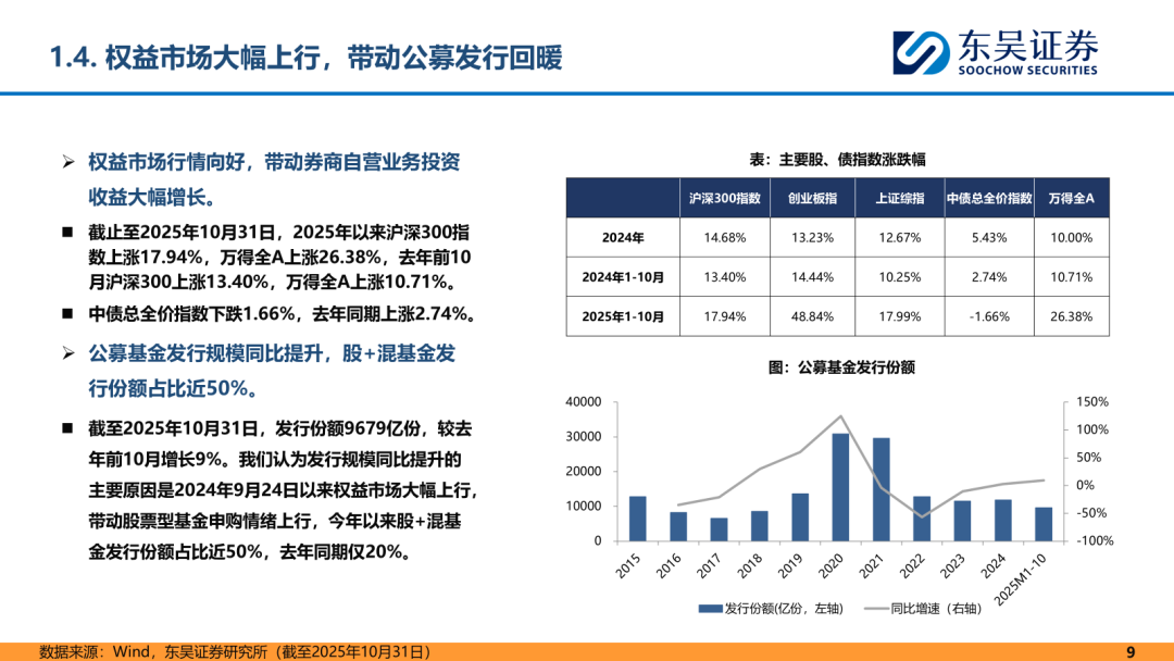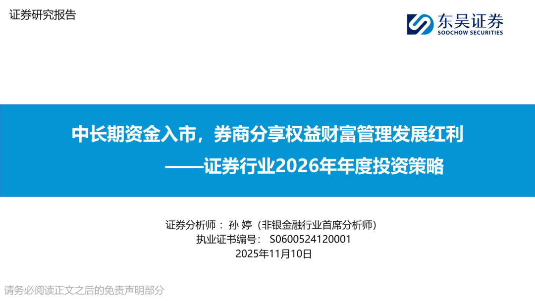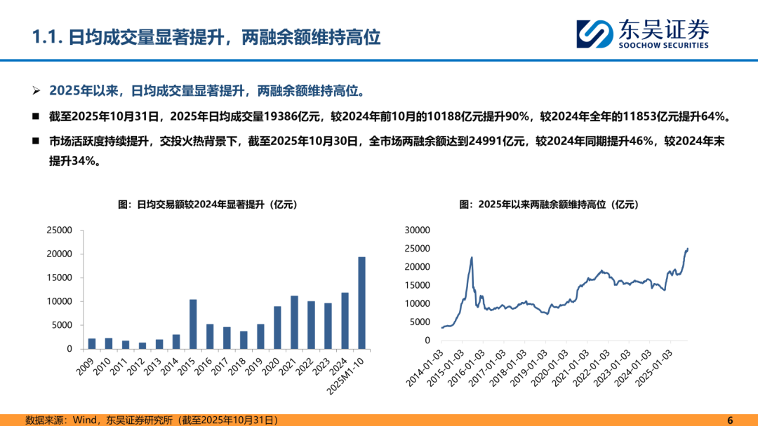 ]article_adlist-->2025年证券行业回顾:交投活跃,权益市场大幅上行。1)日均成交量显著提升,两融余额维持高位。2)IPO发行规模触底回升,增发规模同比提升。3)资管新规以来,通道类资管规模持续下滑。集合资管规模占比持续提升,主动管理转型趋势明显,预计券商资管规模有望企稳,业务结构有望优化。4)权益市场行情向好,券商自营业务普遍收益上行。三季度以来市场行情大幅上行,申购情绪火热,带动公募基金发行规模同比提升。5)2025年前三季度,50家上市券商合计实现营业收入4522亿元,同比增长41%,合计实现归母净利润1831亿元,同比增长62%。若剔除去年三季度华泰出售Assetmark的投资收益及今年一季度国泰收购海通产生的负商誉这两项非经常性损益,上市券商实现归母净利润1746亿元,同比增长63%。所有券商均同比增长或扭亏为盈。