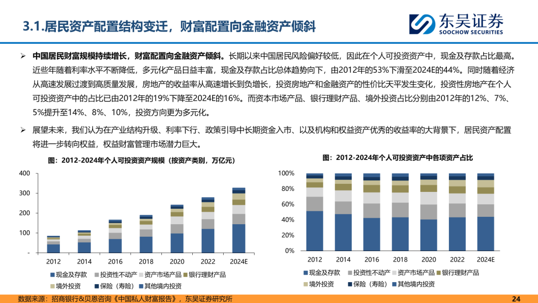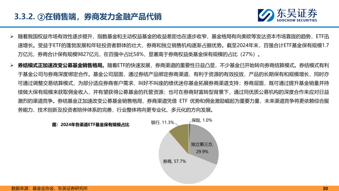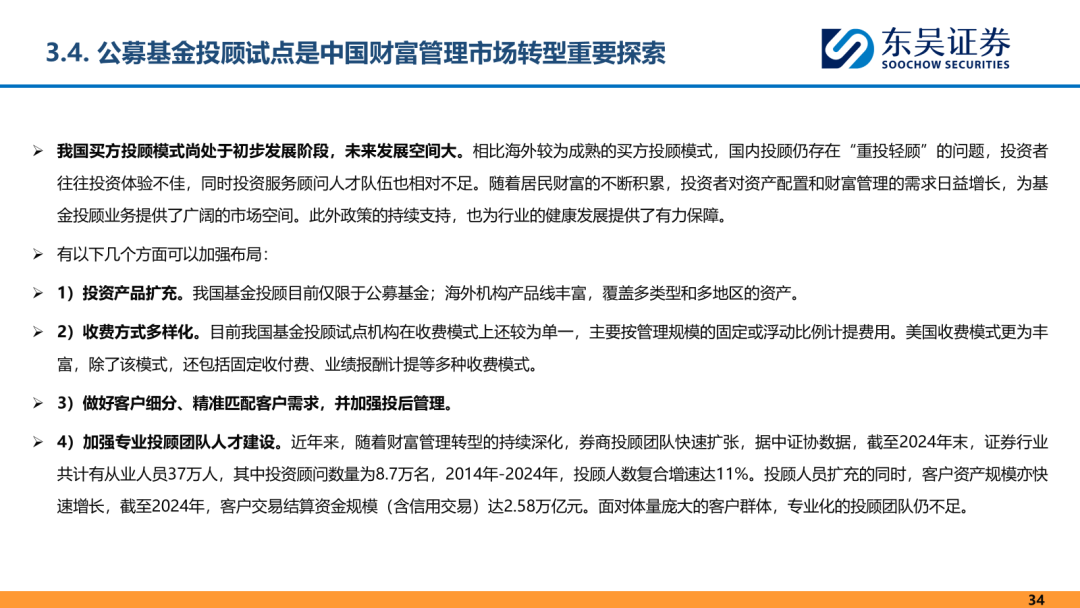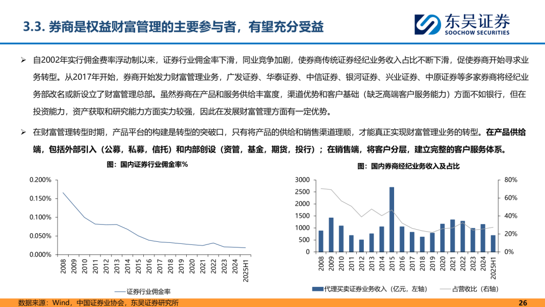 权益财富管理未来可期,券商分享权益财富管理发展红利。1)自2002年实行佣金费率浮动制以来,证券行业佣金率下滑,促使券商开始寻求业务转型。从2017年开始,券商发力财富管理业务。虽然券商在产品和服务供给丰富度,渠道优势和客户基础方面不如银行,但在投资能力,资产获取和研究能力方面实力较强,因此在发展财富管理方面有一定优势。2)在财富管理转型时期,产品平台的构建是转型的突破口,只有将产品的供给和销售渠道理顺,才能真正实现财富管理业务的转型。在产品供给端,包括外部引入(公募,私募)和内部创设(资管,基金,投行);在销售端,将客户分层,建立完整的客户服务体系。