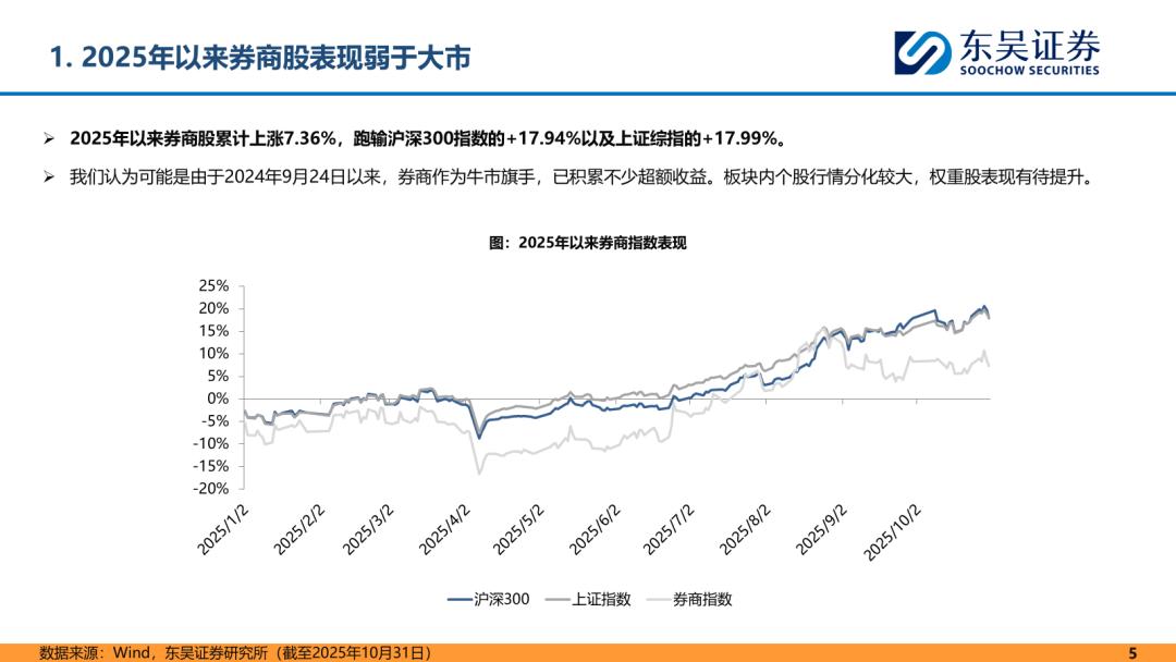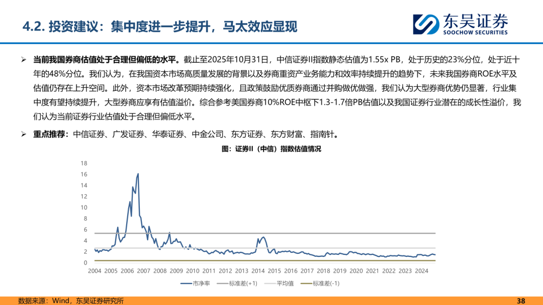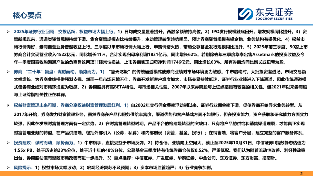 投资建议:谋时而动,顺势而为。1)牛市旗手,直接受益于市场反弹。2)持仓低,业绩向上空间大。截止至2025年10月31日,中信证券II指数静态估值为1.55x PB,处于历史的23%分位,处于近十年的48%分位。公募基金三季度持有传统券商仓位仅0.52%,严重低配。我们认为随着流动性改善、利好性政策出台,券商股估值有望随市场改善而进一步提升。3)重点推荐:中信证券、广发证券、华泰证券、中金公司、东方证券、东方财富、指南针。